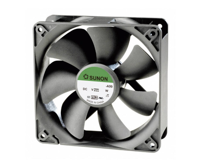 DC axial cooling fan, 92x92x25, 12V, 125mA, 1.50 watts, 51.5cfm, 34dBA, ball bearing, with wire leads.