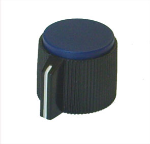 Black plastic knob with blue top cap / cover and extended indicator with white strip, high=16.2mm
