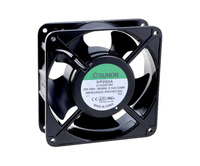 Cooling fan, axial, 120x120x25, 220VAC, sleeve bearing, 2000rpm, 64cfm , 0.1A, 19W, 43dBA, with terminals