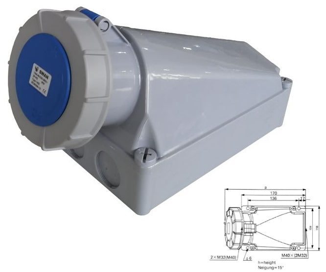Industrial cee wall-mount socket 63 amps 220-380v 3 pole + earth ip67, id=84mm