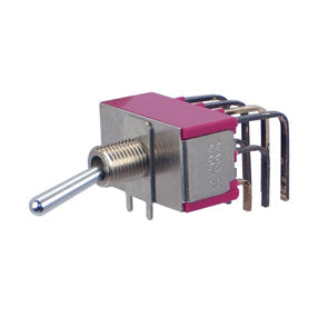 Toggle switch, miniature, qpdt, on-mom, 2 position, right angle, pcb mount, pcb terminals, 5a @ 120vac / 28vdc
