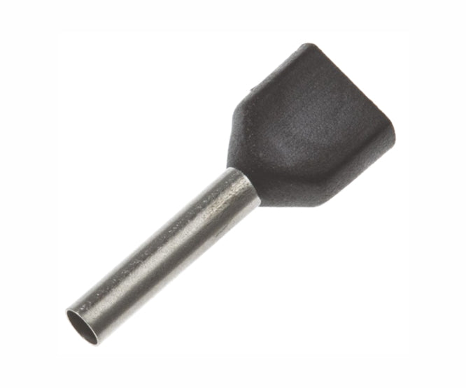Wide , dual cable entry insulated black terminal, boot lace, black, for 2x1.5mm2 wires l1=12, l2=20 twin entry.
